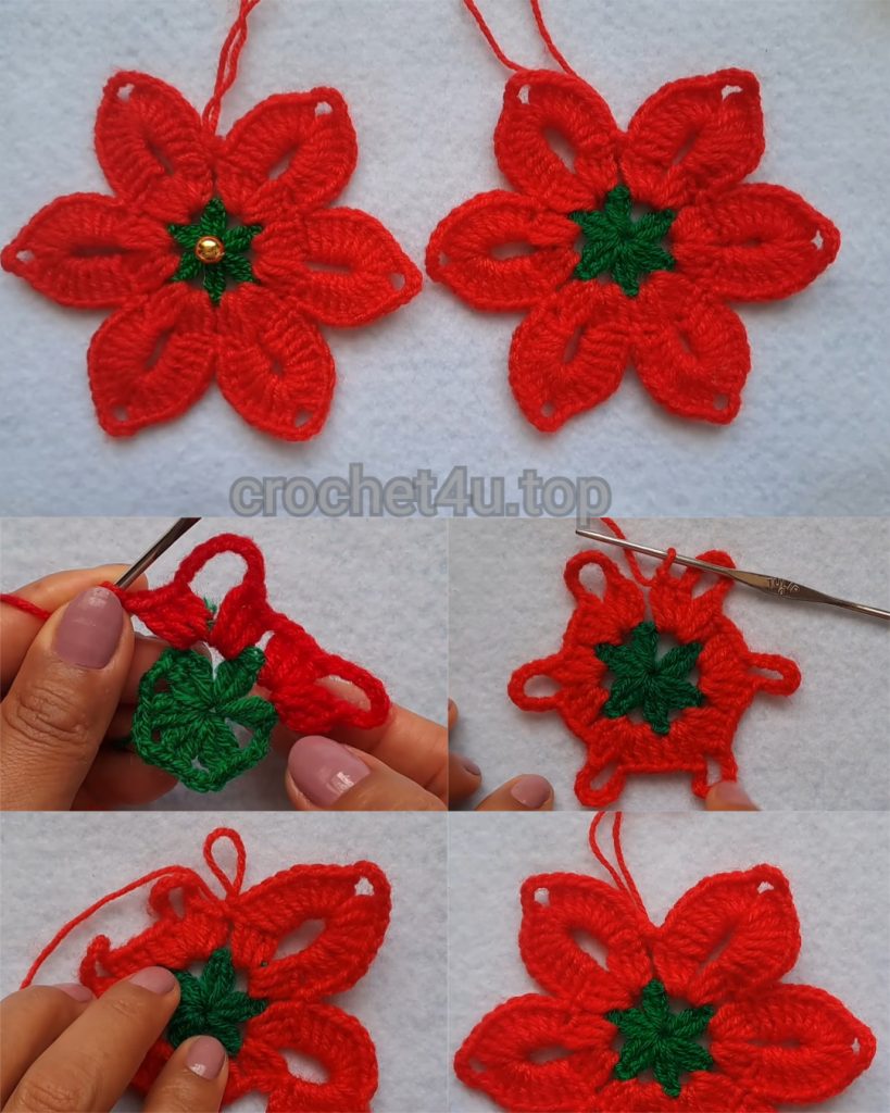 This pattern is constructed in two simple stages: first, creating a hexagonal green base that serves as a sturdy foundation. Second, working large, bold red petals into the chains of the base to give the flower its characteristic star shape and rich texture. This is an excellent project for using up leftover yarn scraps in your holiday colors!