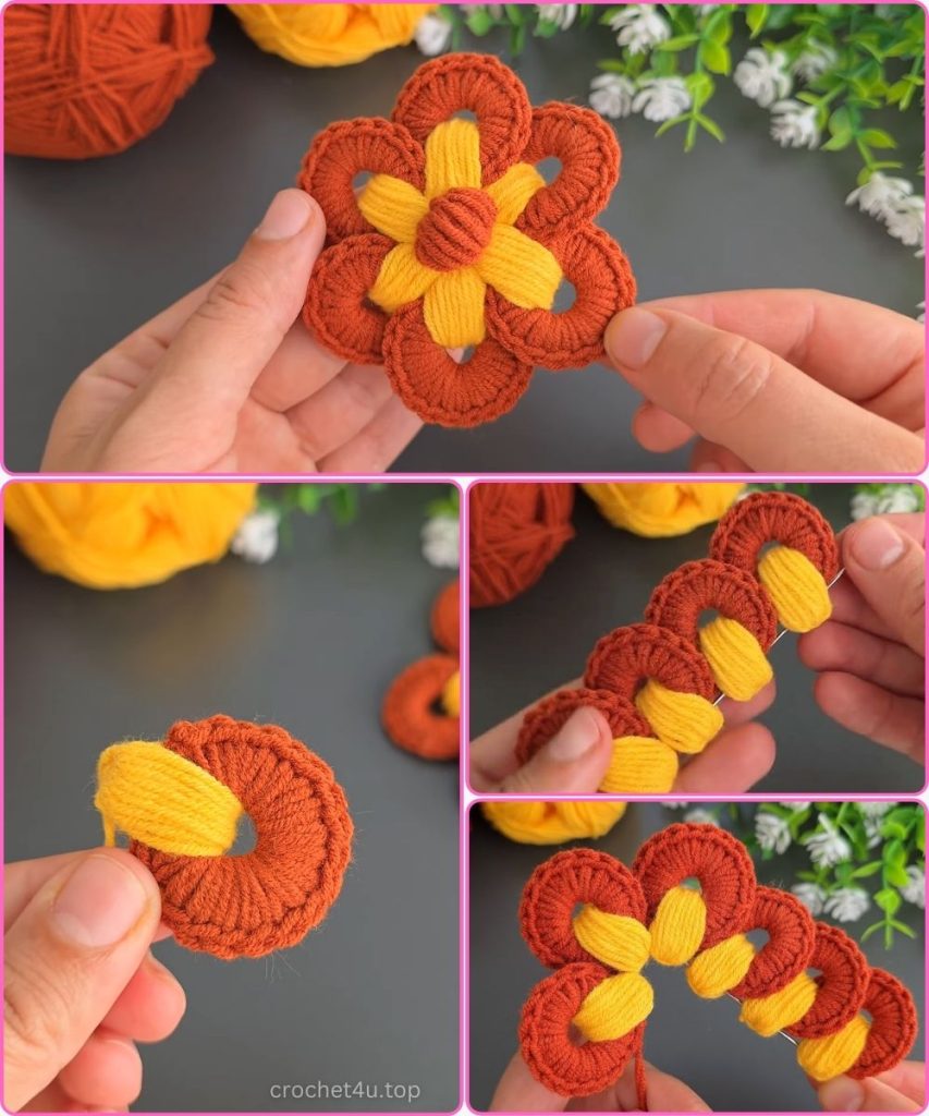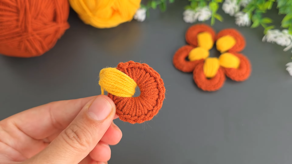 - In the first Ch-3 space, work: (SC, HDC, 3 DC, HDC, SC). (Petal made).