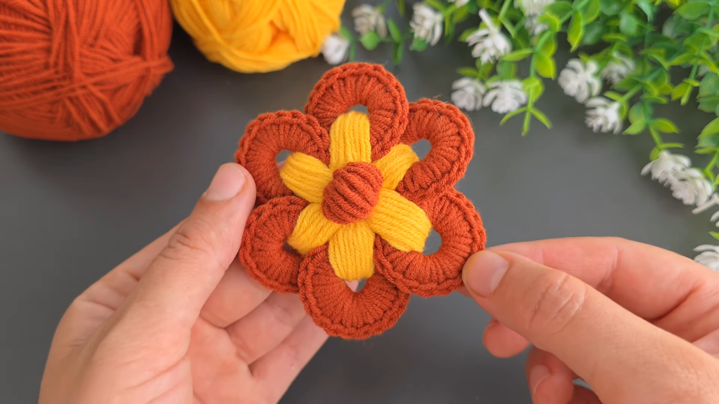 - Fasten Off: Cut the yarn, leaving a generous tail for weaving in or attaching the flower to a project. Pull the tail through the last loop to fasten off.
