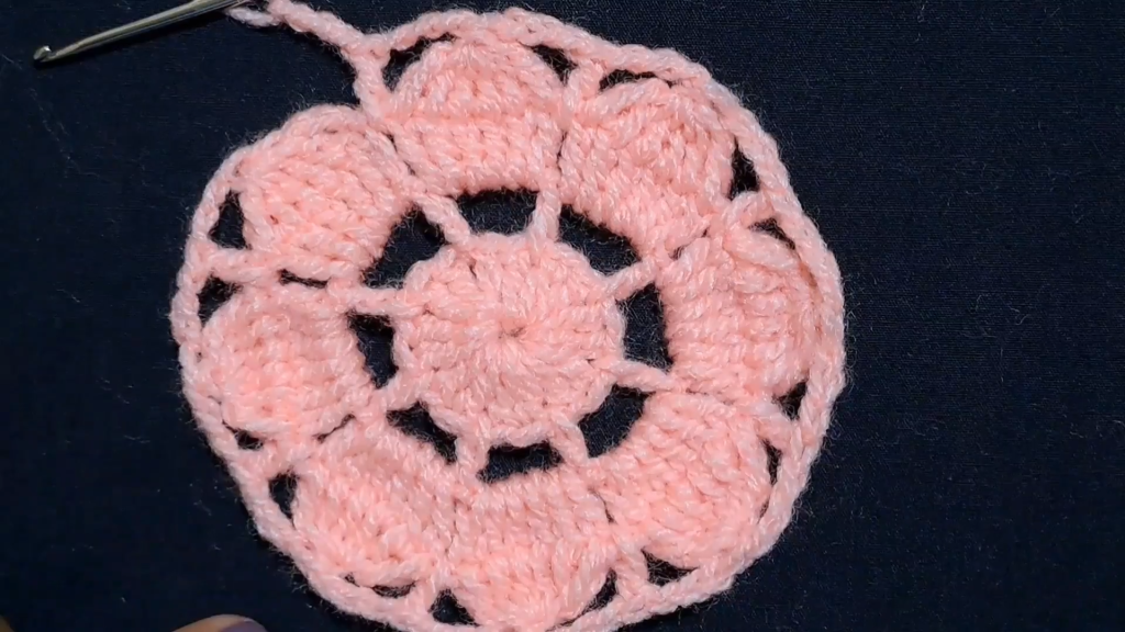 - (Stitch Count: 8 Popcorns, 8 DC, 16 Ch-3 spaces)