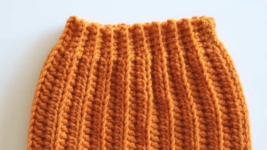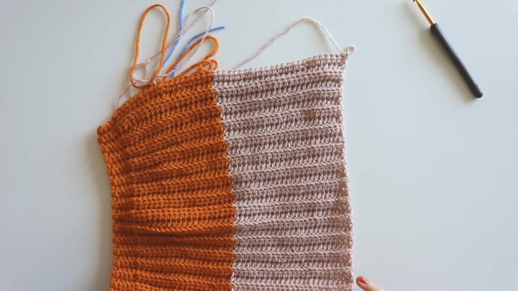 Rows 15 – 30 (C B): Hdc in the BLO of the first 48 sts. Work a standard HDC in BOTH loops of the last st. Ch 1, turn. (49 hdc)