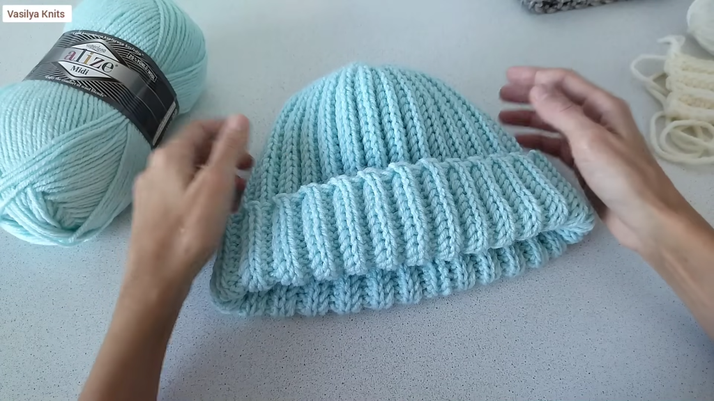 2. Cuff: Fold the bottom edge (the brim) of the hat up to create the wide cuff. The ribbing will naturally allow for a crisp, clean fold. The cuff should measure approximately 3-4 inches.