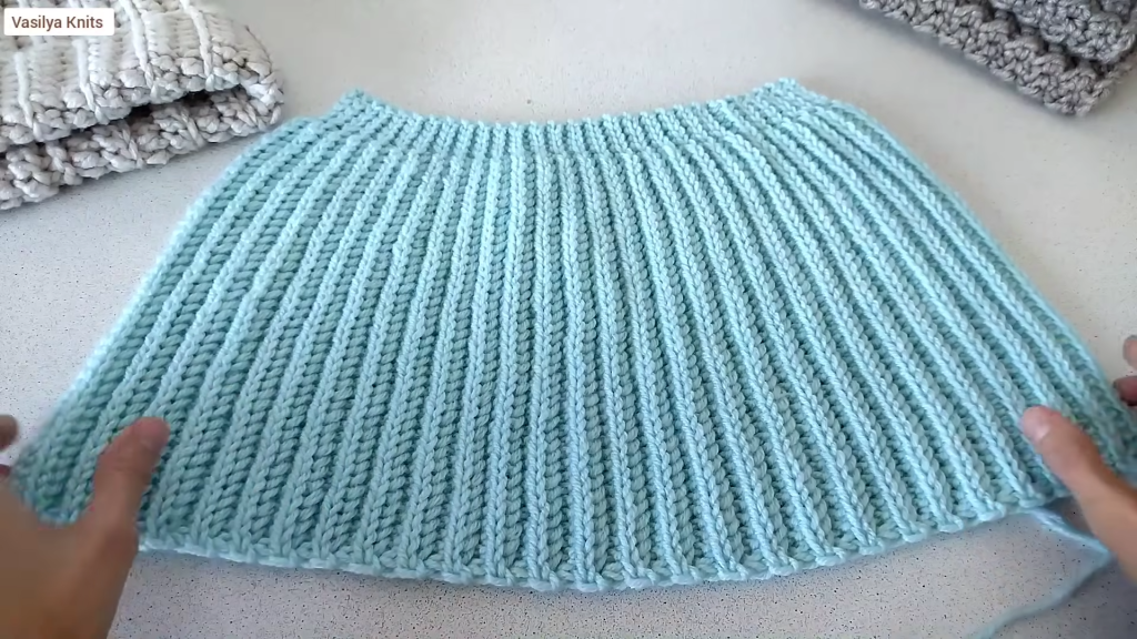 • Ribbing (in HDC BLO): A 4-inch (10 cm) square should be 12 rows wide (counting the ridges) and 11 stitches tall (along the long edge/height).