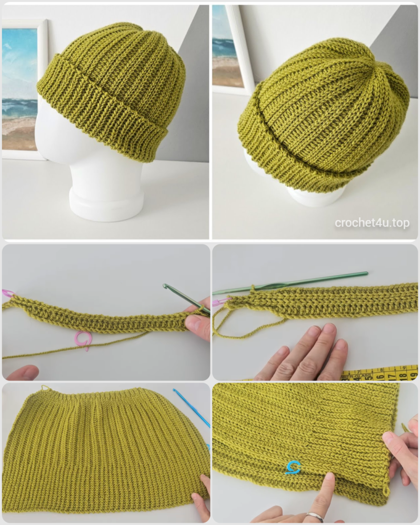 The fantastic texture that mimics knitting is achieved entirely through the Half Double Crochet in the Back Loop Only (HDC BLO) stitch. This simple technique gives the fabric amazing stretch—perfect for a comfortable, snug fit. This hat, shown here in a rich, earthy olive green, is a timeless piece and a wonderful blank canvas for your favorite colors!