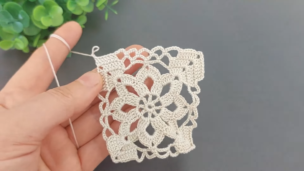 Round 10 (Final Point Shaping): Sl st to the ch-1 sp of the first Shell. Work a (dc, ch 1, tr, ch 1, tr, ch 1, dc) Point Shell in the ch-1 sp of the Shell. [Final Side] Ch 4, sc in the ch-3 sp, ch 4, sc in the ch-5 sp, ch 4, sc in the ch-3 sp, ch 4. Work a Point Shell in the ch-1 sp of the next Shell. [Final Side] Ch 4, sc in the ch-3 sp, ch 4, sc in the ch-5 sp, ch 4, sc in the ch-3 sp, ch 4. Rep from * 7 more times. Sl st to the first dc of the starting Point Shell to join. (8 Point Shells, 24 sc, 32 ch-4 sps)