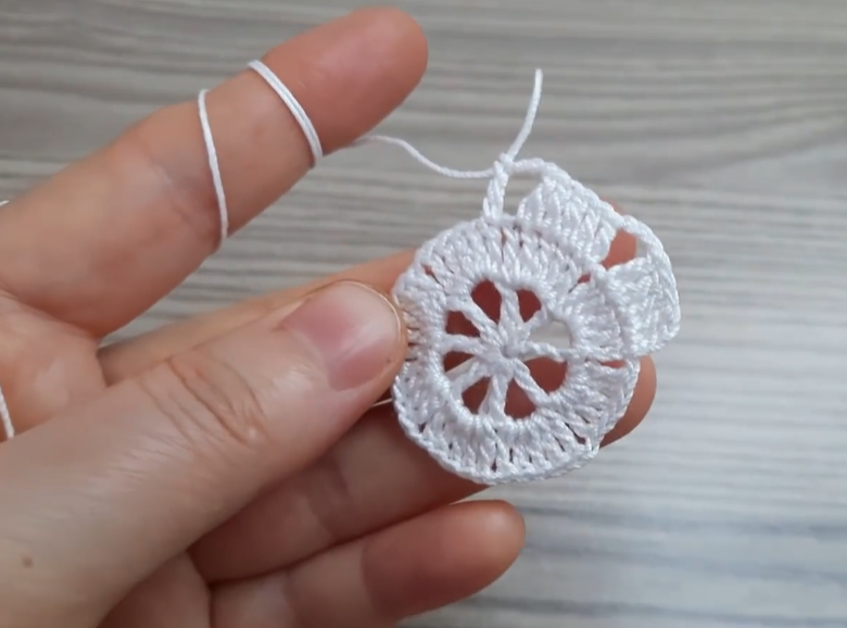 Round 4 (Second Petal Row): Ch 3, dc in the next 2 dc. [Arch] Ch 4, sk ch-3 sp. Dc in the next 3 dc. Ch 4, sk ch-3 sp. Rep from * 5 more times. Sl st to the top of the starting ch-3 to join. (18 dc, 6 ch-4 sps)