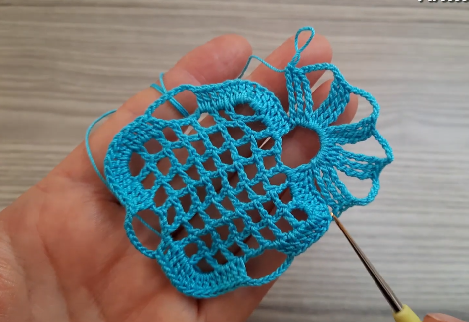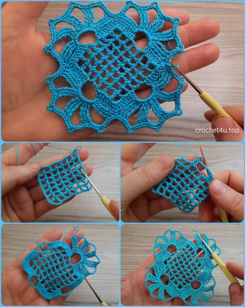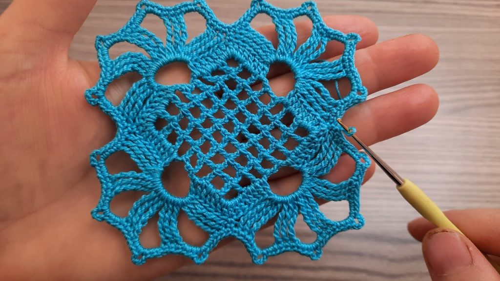 Introduce a splash of vibrant lace into your next project with the Azure Windowpane Square! This unique motif cleverly combines a traditional square shape with circular elements, creating the visual effect of open “windowpanes” surrounded by delicate lace. It’s a wonderful intermediate-level pattern, perfect for making afghans, scarves, or light summer shawls by joining multiple squares together.