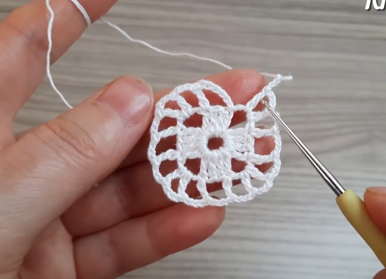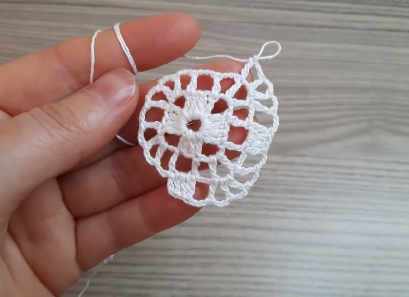 Round 2: Ch 5 (counts as 1 dc, ch 2). Sk 1 st. Dc in the next st, ch 2, sk 1 st. Rep from * 7 more times. Sl st to the 3rd ch of the starting ch-5 to join. (8 dc, 8 ch-2 sps)