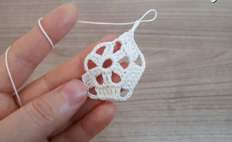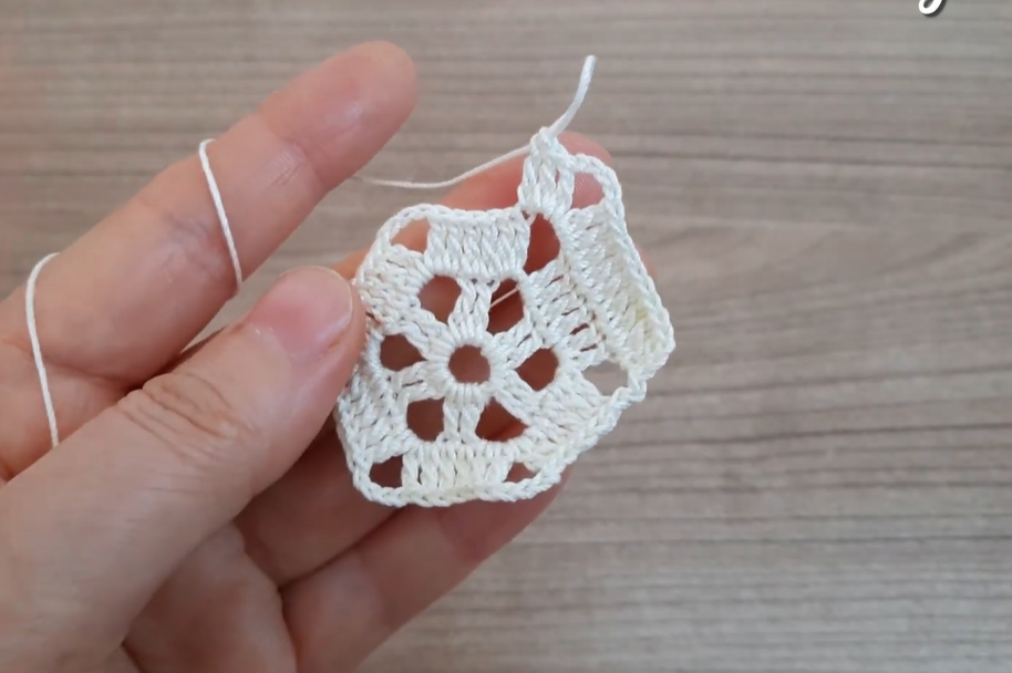 Round 7 (Shell Setup): Sl st to the center sc of the side group. Ch 3, 4 dc in the same st (Shell). Ch 3, sc in the center of the first ch-5 arch. Ch 3, sc in the center of the next ch-5 arch. Ch 3. [Side/Shell] Shell in the center sc of the next side group. Rep from * 3 more times. Sl st to the top of the starting ch-3 to join. (4 Shells, 8 ch-3 sps, 8 sc)