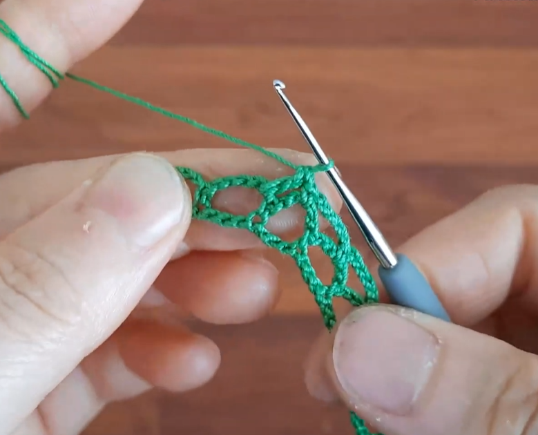 - In the central sc (the second one) of the Fan’s loop section, work (tr, ch 1) five times, tr (a 6-tr Fan).