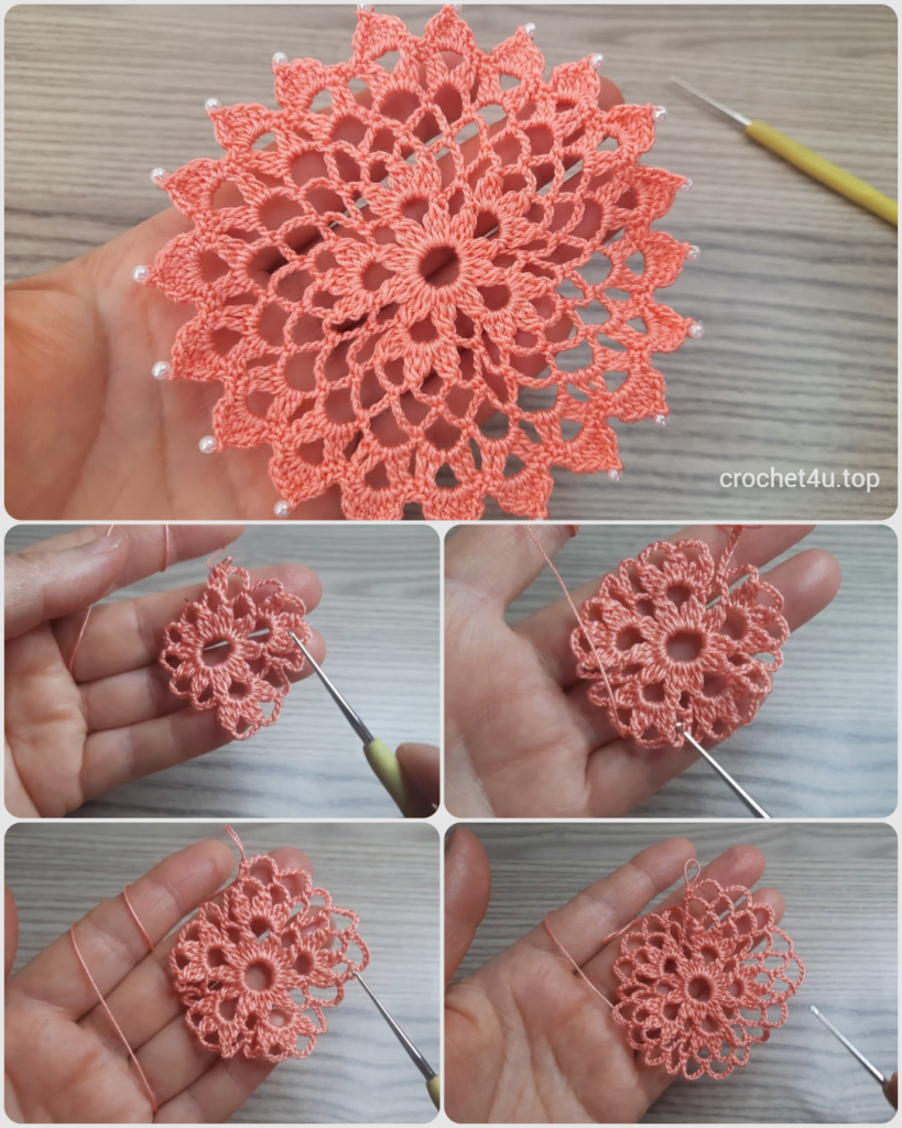 - Gently pin the motif to a padded surface. Pin out the 16 outer points (the V-stitches) until the piece is a perfect, flat circle and the beads are sitting right at the tips.