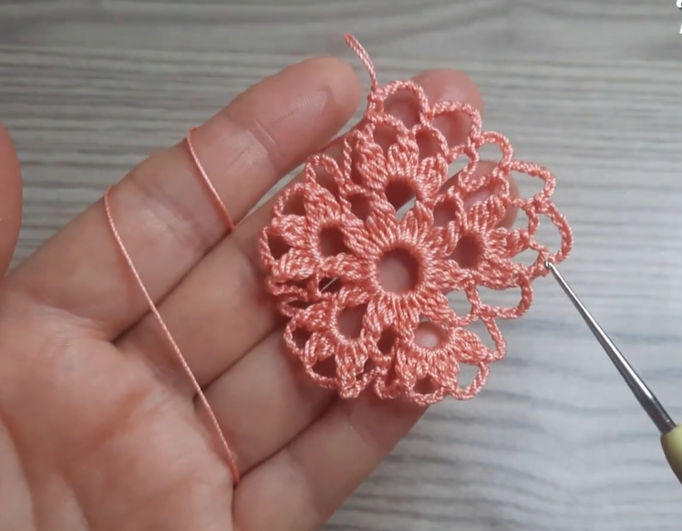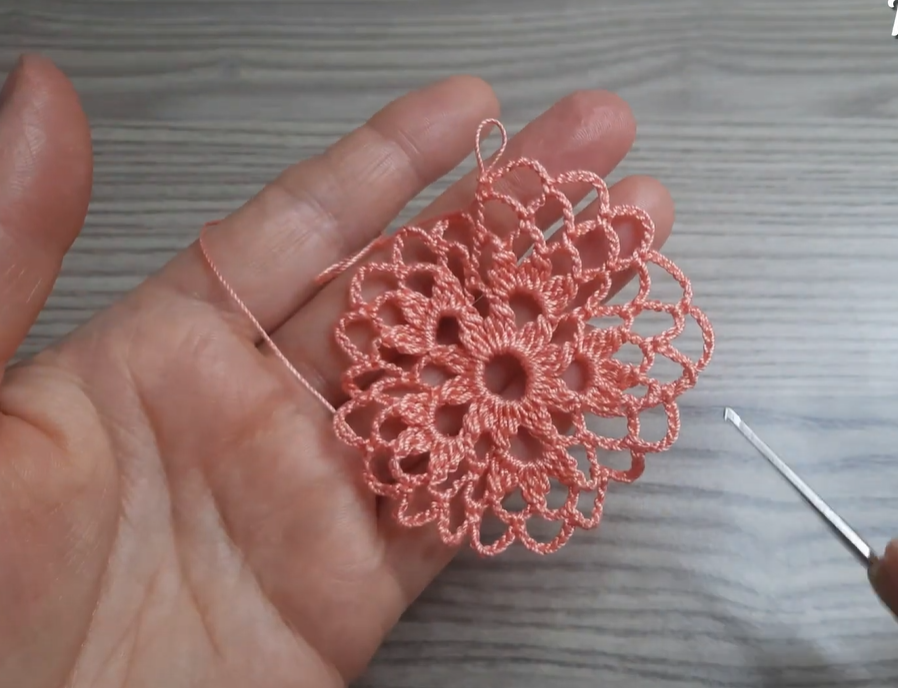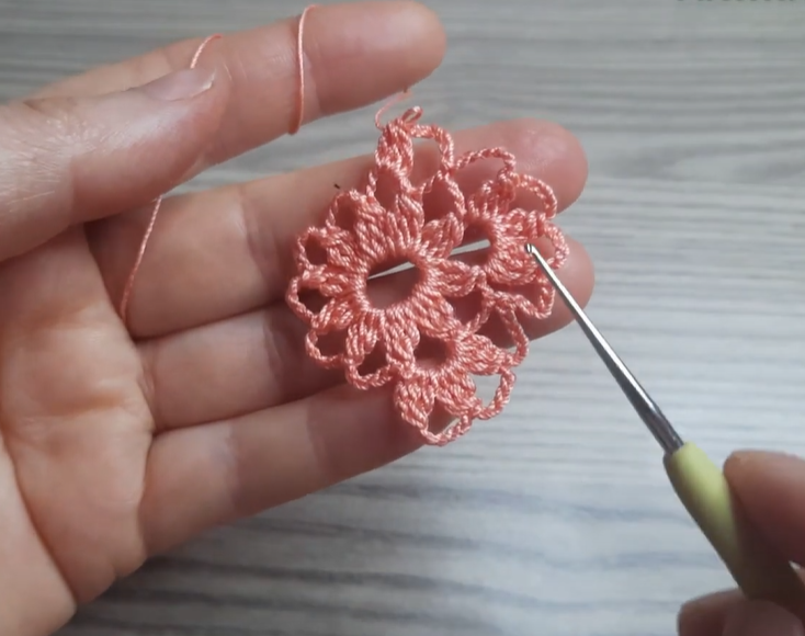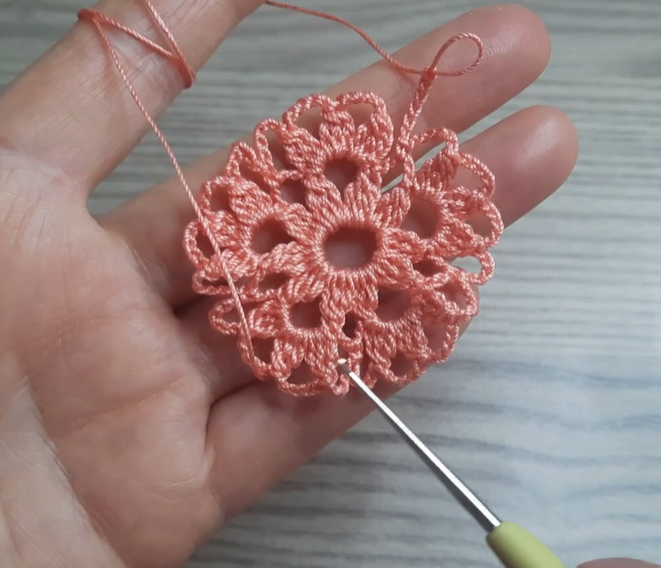 - sl st into the first ch-4 space until you reach the center (2nd ch).