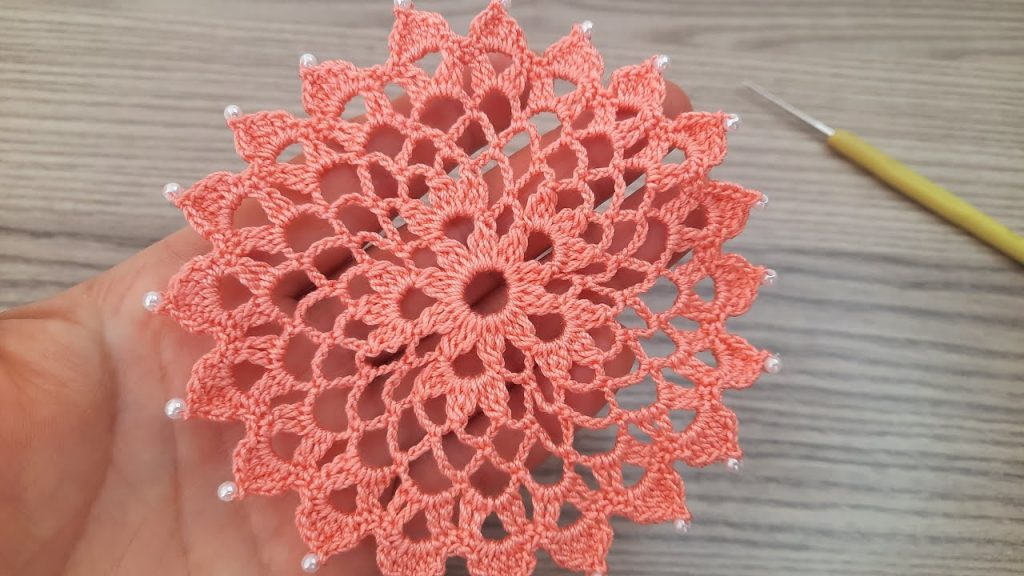 Welcome, crochet artists! Today’s project is a small, vibrant motif that combines intricate lacework with the sparkle of beads for a truly luxurious finish. This piece is perfect as a coaster, an ornament, or as a striking appliquéd decoration. The layered structure gives it wonderful dimension.