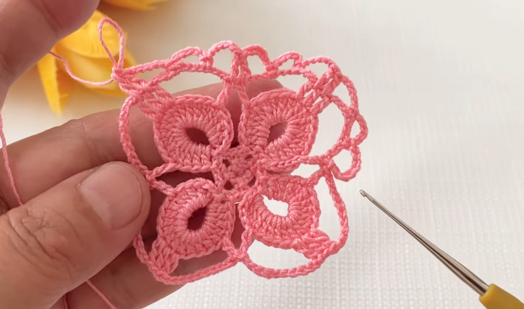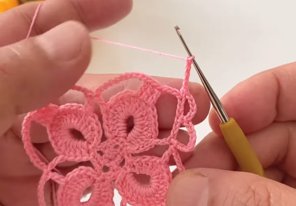 • End with ch 4. sl st to the first sc to join. (8 ch-4 loops)