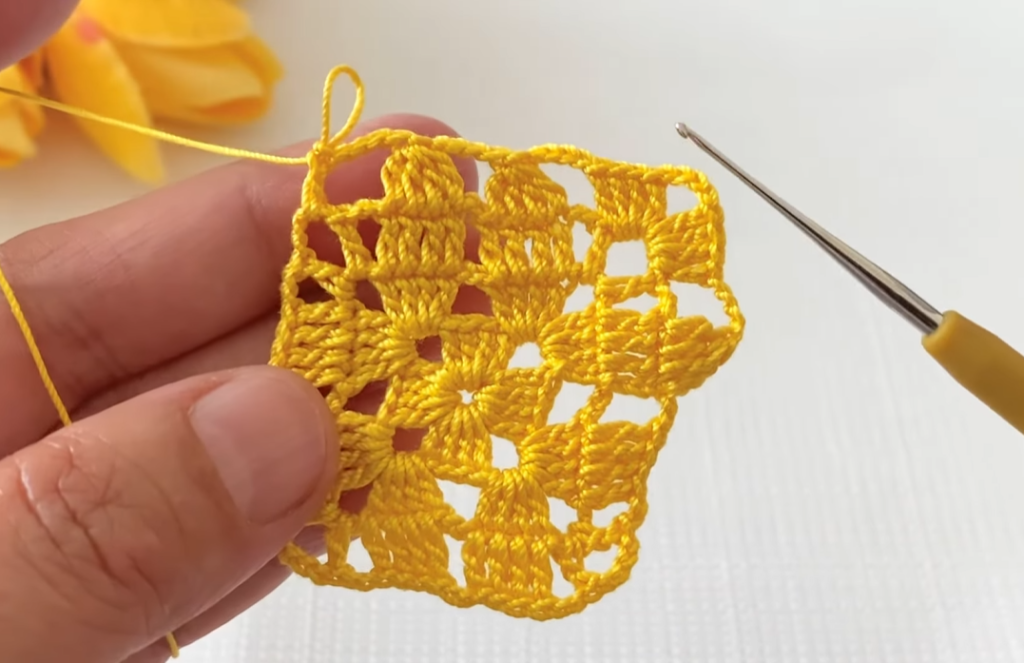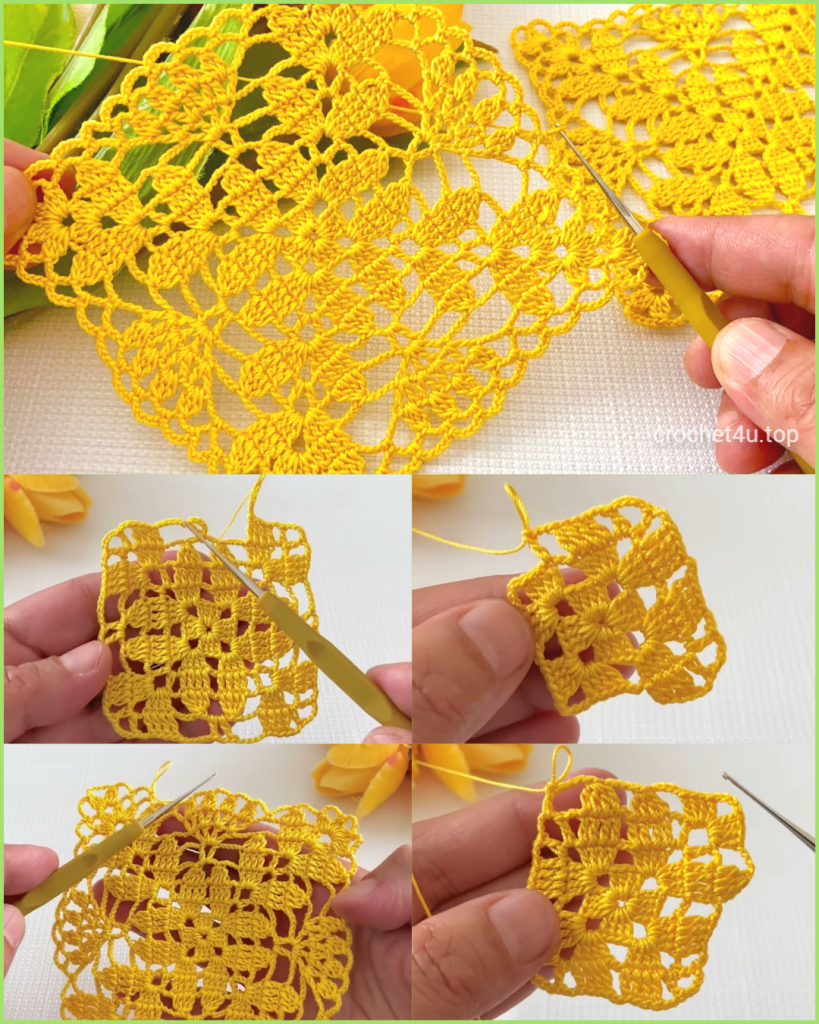 Bring the brightness of a summer day to your home décor with this beautiful crochet lace square. This motif features a striking central flower design, framed by a delicate, radiating lattice. The repeating pattern makes it easy to master, and the finished squares can be joined seamlessly to create stunning projects like doilies, runners, or elegant curtains.