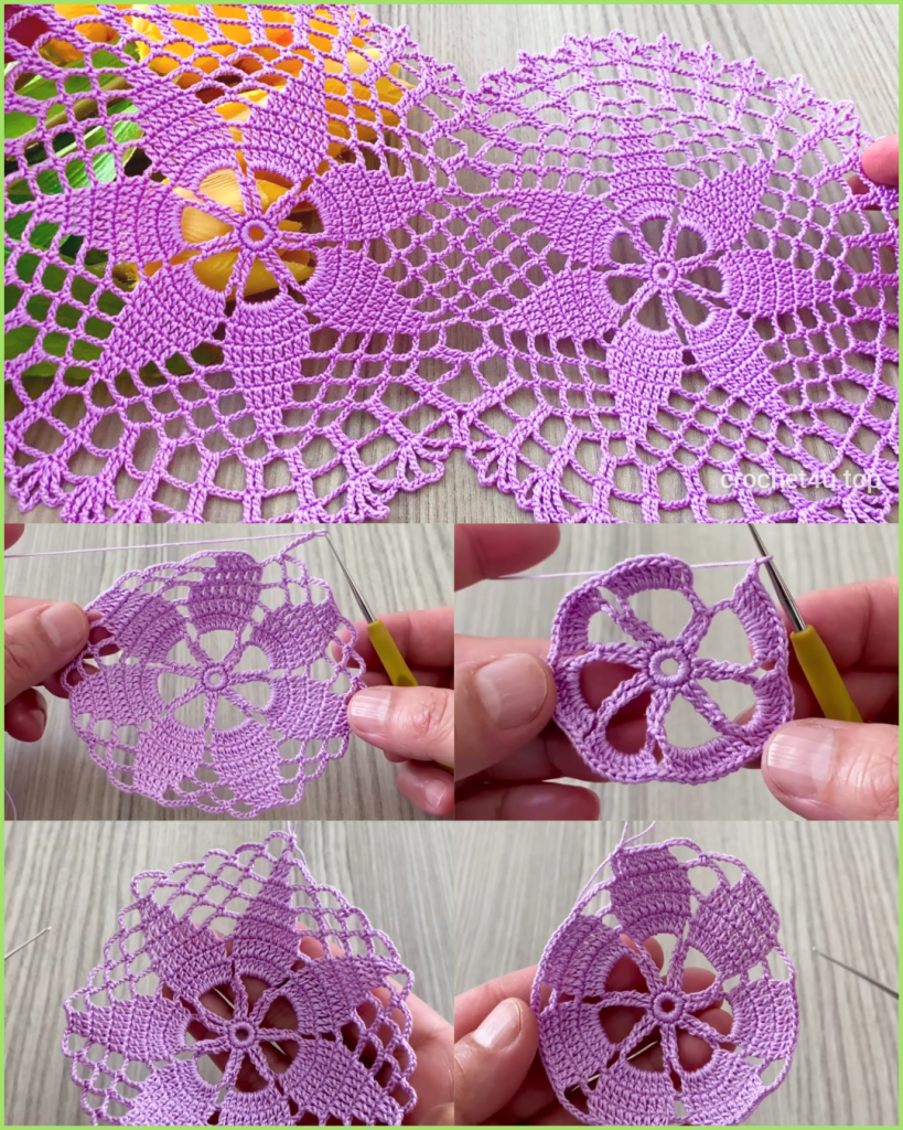 Continue the ch 5 lattice and sc joins across Motif 2 exactly as in Row 4. Stop when you have worked across 3 petals of Motif 2 (4 ch 5 loops total). Turn.