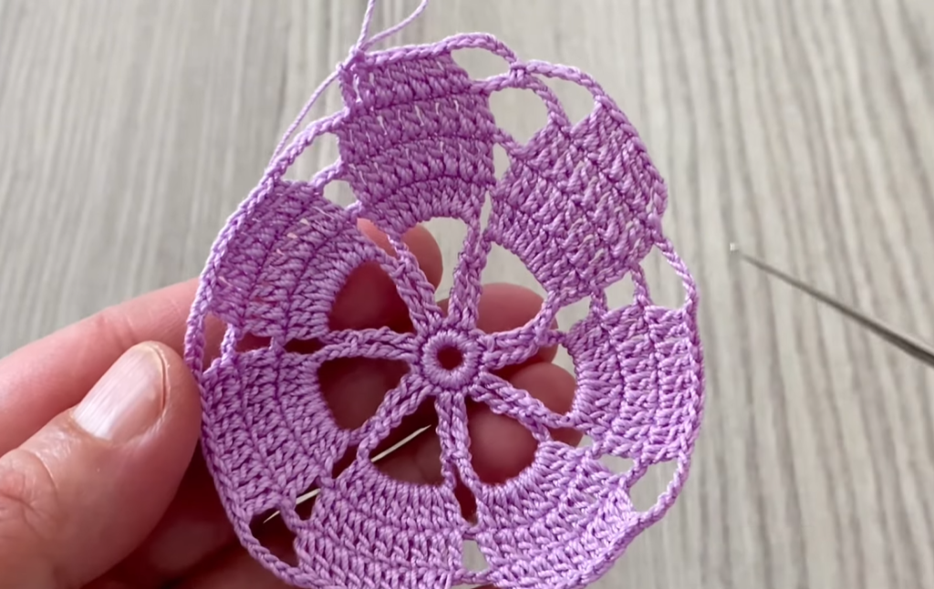 Round 3 (Solid Petals): sl st into the first ch 5 loop. ch 4 (counts as tr). In the same loop, work: 4 tr,ch 2,5 tr. This forms the first petal. sl st into the next ch 5 loop. In the loop, work: 5 tr,ch 2,5 tr. Repeat this sequence 4 times more. sl st to the top of the starting ch 4 to join. (6 petals)