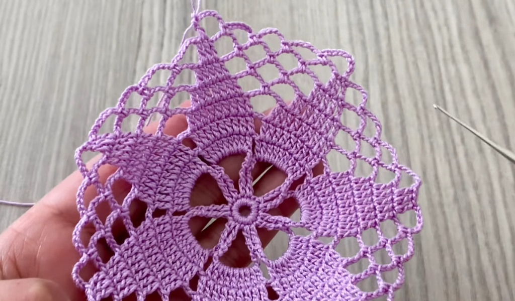 - Petal 4/5 Scallop: In the ch 2 space of the 4th petal, work 3 sc,ch 3,3 sc. ch 5.