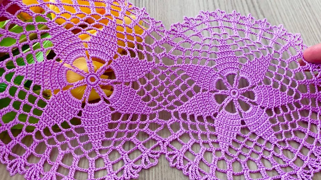 Repeat this pattern across the entire length of the border, creating a scallop on the 4th, 5th, and 6th petals of each motif, and connecting with the ch 5 lattice.