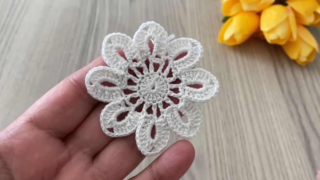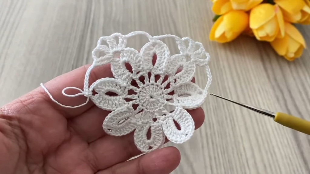 - Sl st to the top of the beginning ch 3 to join. [8 Petals]