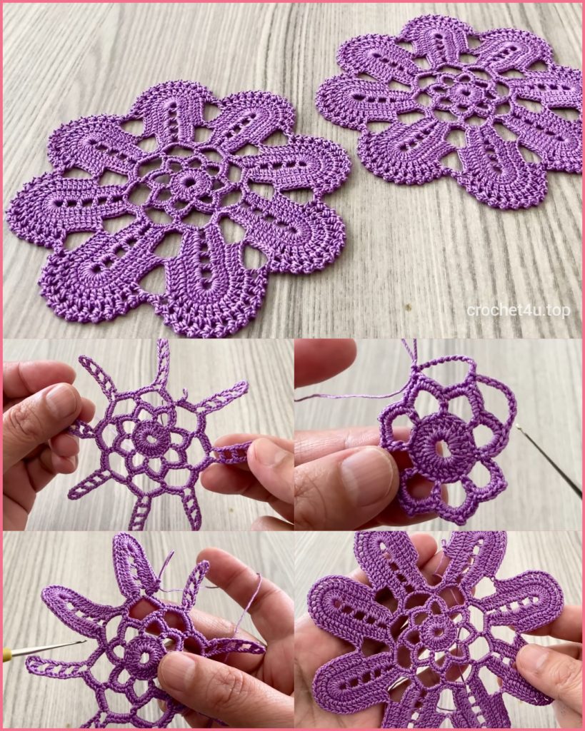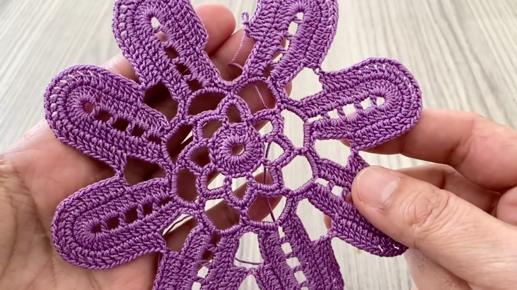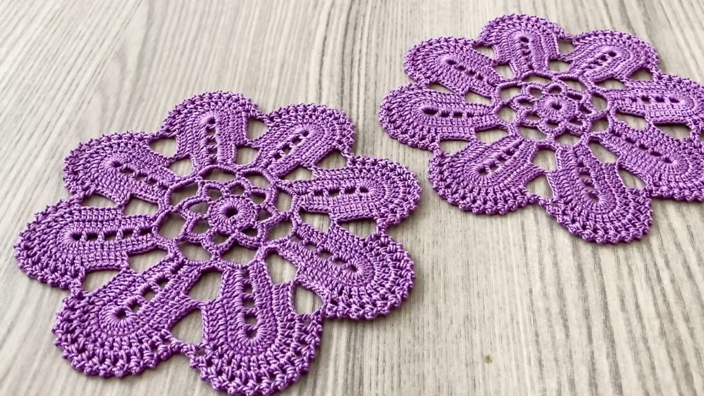Welcome to the blog! Today’s project focuses on crafting a stunning 8-petaled floral motif that’s perfect for a coaster or small doily. The design is built around a tight center, radiating outward to form unique, tear-drop shaped petals with textured surfaces and a final scalloped edge. This pattern requires careful counting and layering stitches to achieve the dimensional look seen in the photo.