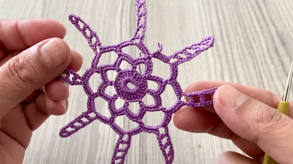 - Repeat from * to * around. You will have 8 ch-3 loops.