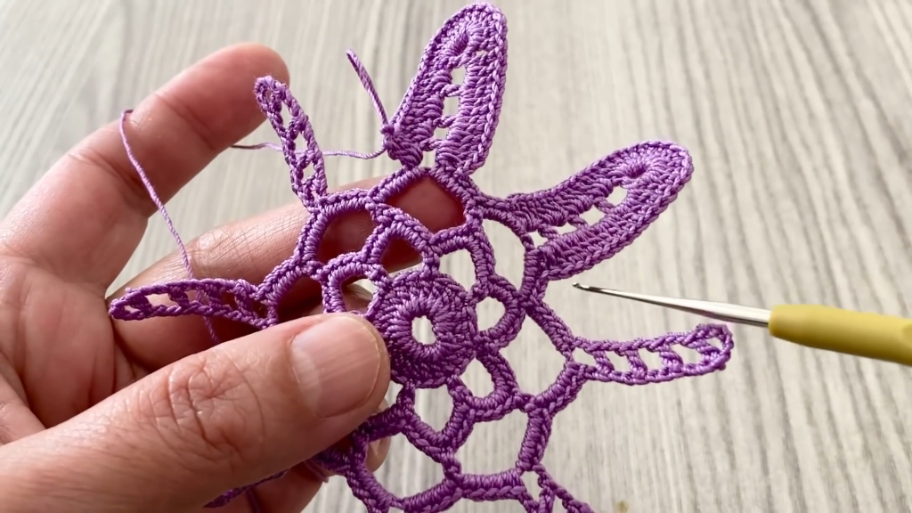 - Shell (5 dc) in the next stitch (this should be the center of the petal’s curve, the 9th stitch of the petal).