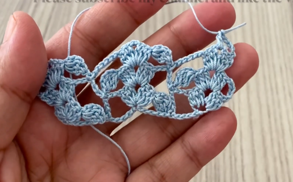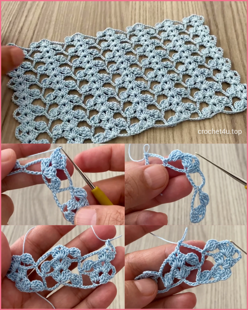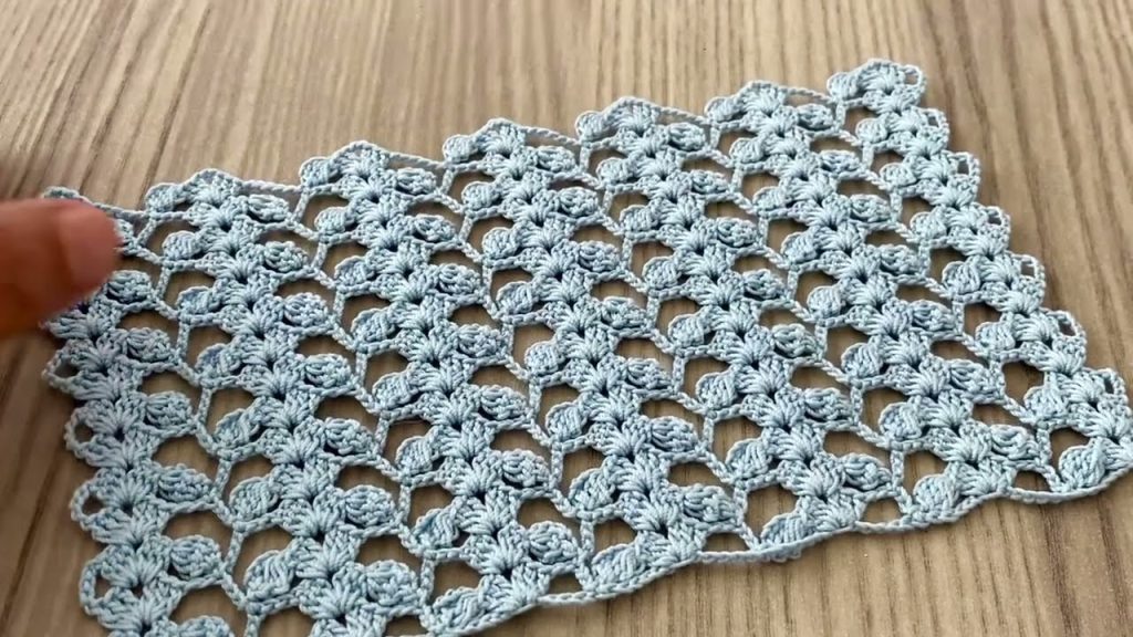 Welcome to a pattern that’s all about beautiful repetition! The stitch shown in the image creates a dense, shell-like cluster surrounded by open lattice work, resulting in an elegant, all-over fabric. This pattern is often called a Cluster Lace or Web Stitch. It’s easily adjustable to any size project—from a thin scarf to a full-sized blanket—simply by chaining more foundation stitches.