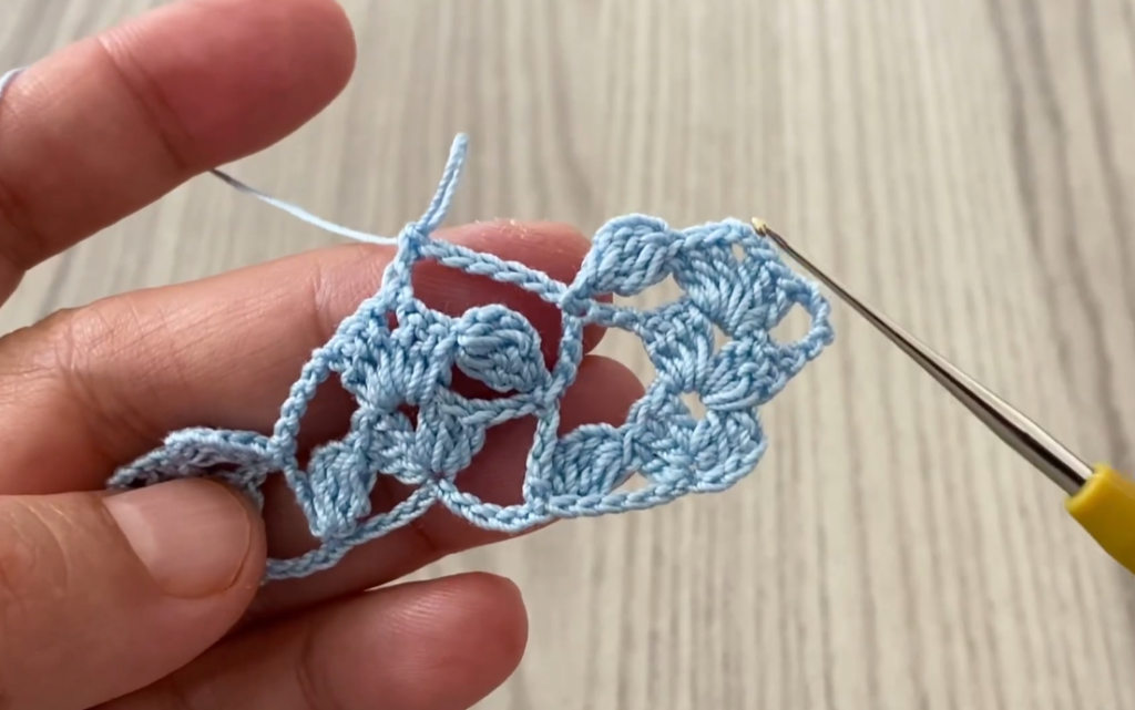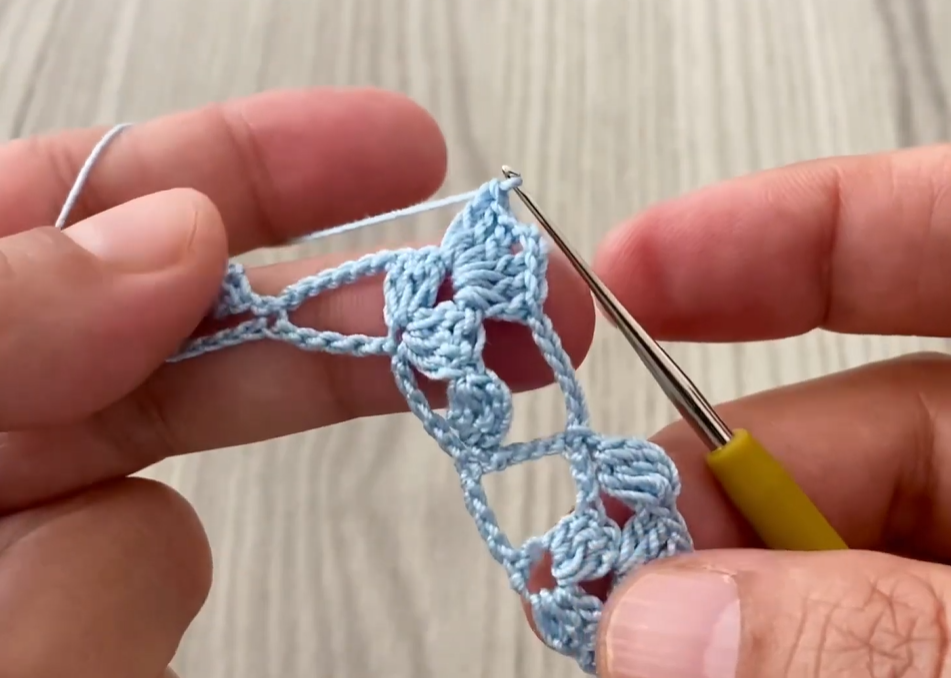 - Row 2 (Lattice): The sc stitches anchor the long ch-5 loops into the ch-3 sps (the cluster tips) and the ch-3 sps (the space between clusters). The row must end with a ch 2, dc for height.