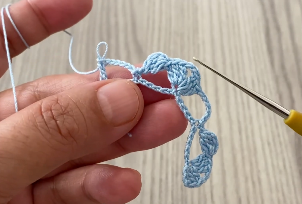 - Ch 3, sk 5 chs, dc in the last ch. Turn.