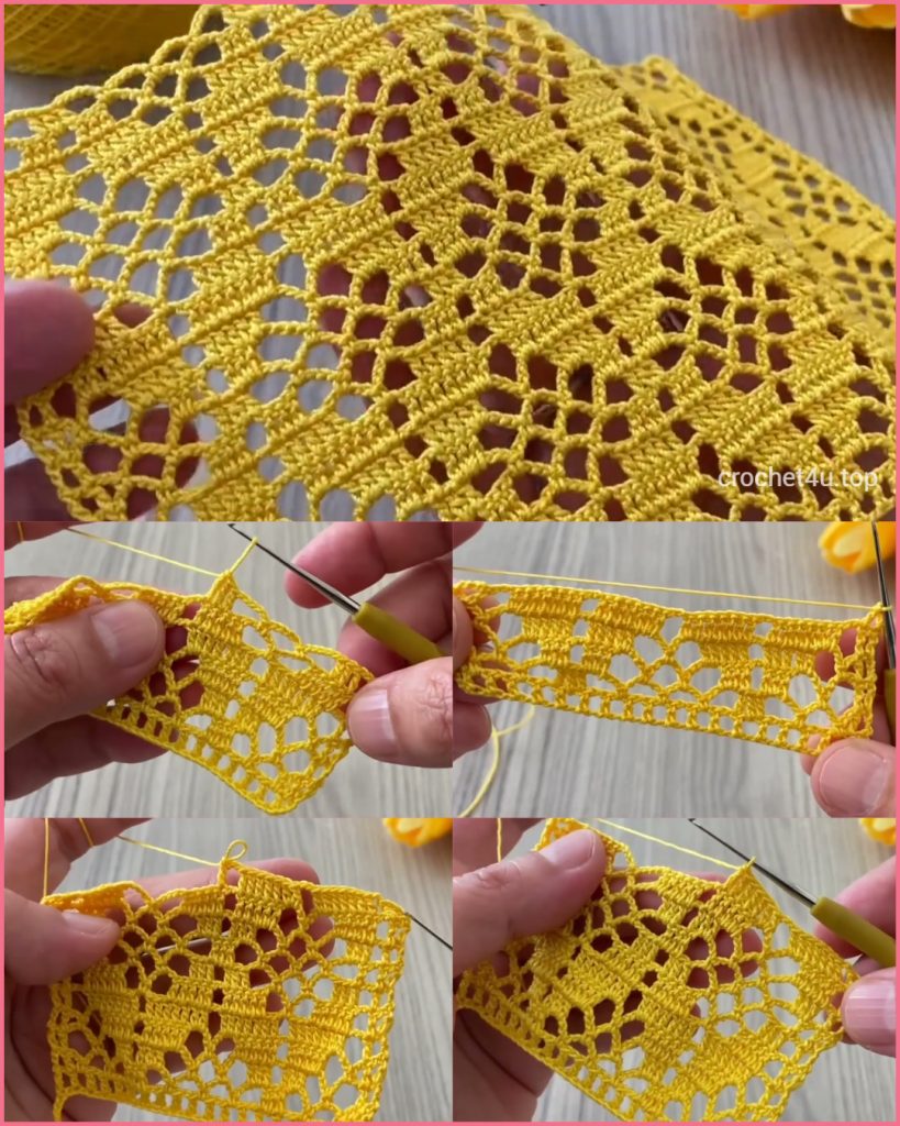 Welcome to a pattern that proves lace doesn’t have to be fussy! The gorgeous yellow fabric in the image uses a rhythmic two-row repeat to create an interlocking network of dense ‘V’ shapes and open lattice work. This design offers a wonderful balance of warmth and ventilation, making it perfect for year-round accessories like shawls, table runners, or even beach cover-ups.