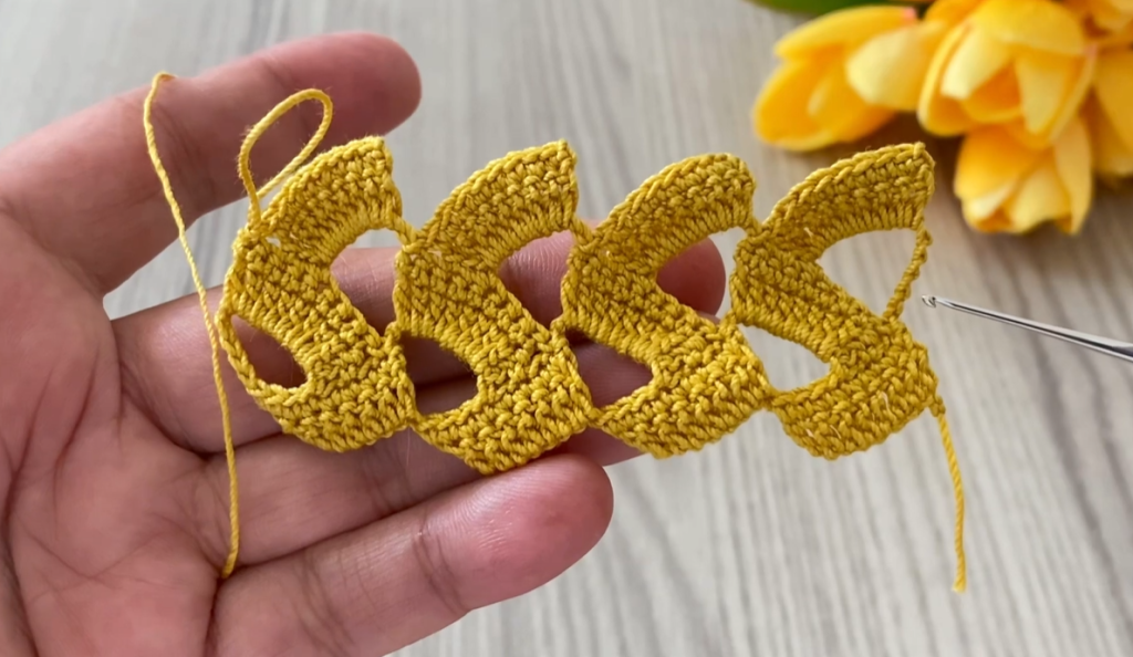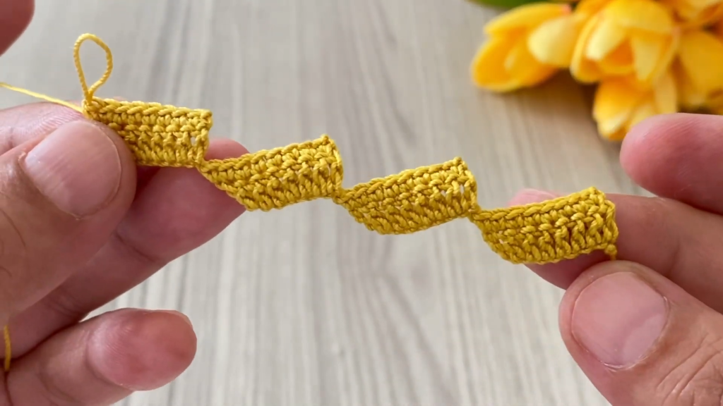 For a clean, defined wave, choose a yarn that holds its shape well. The sample uses a vibrant yellow in what appears to be a cotton or mercerized cotton yarn.