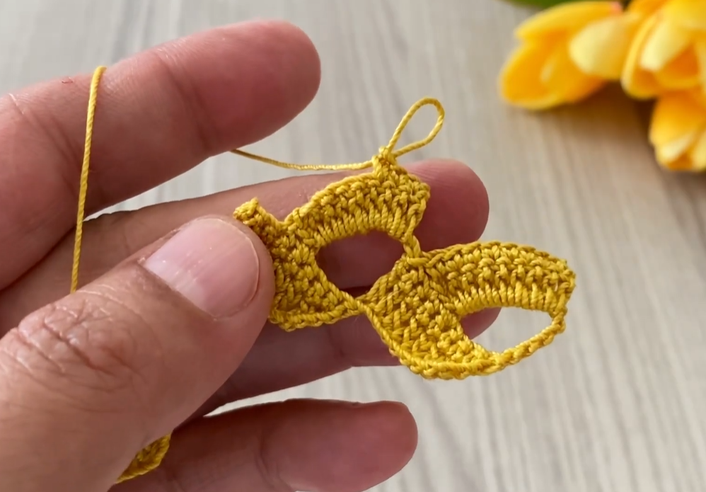 - *Ch 5, sk 5 chs, sc in the next 5 chs.*