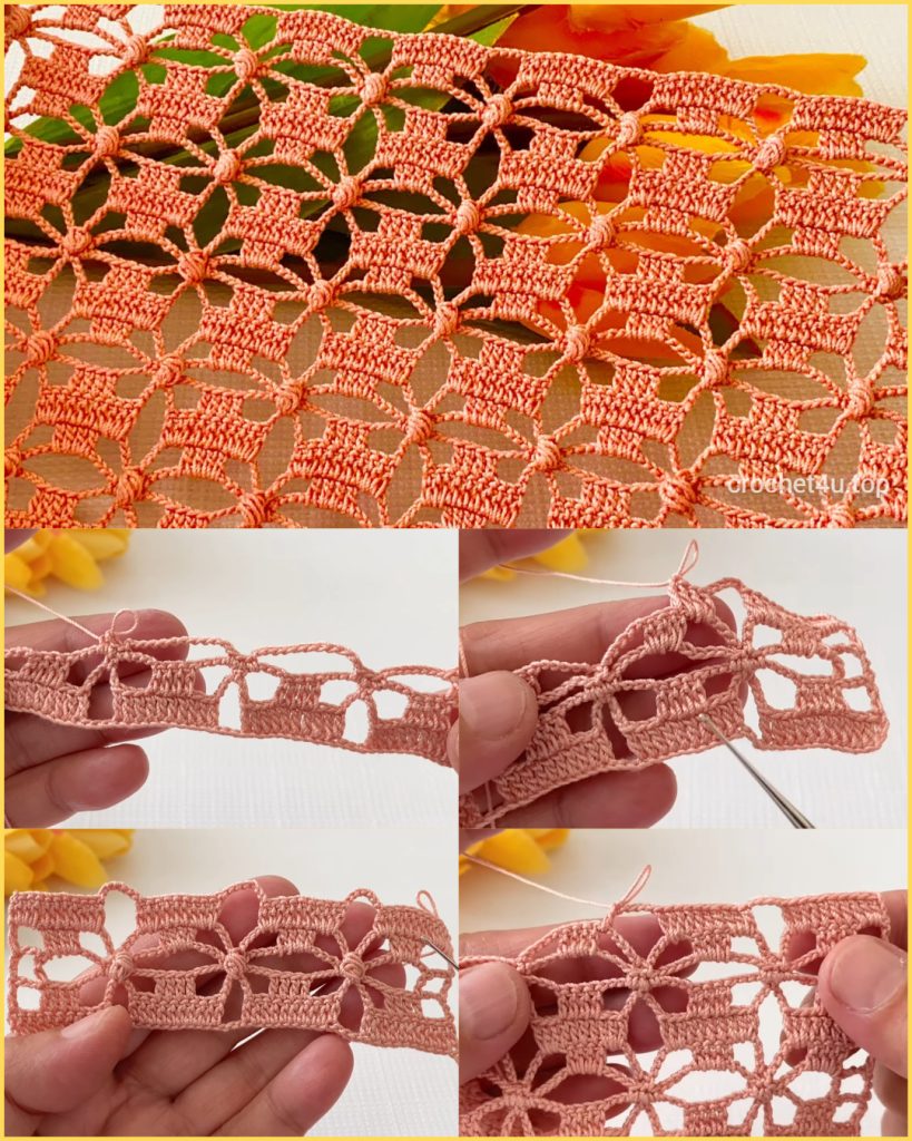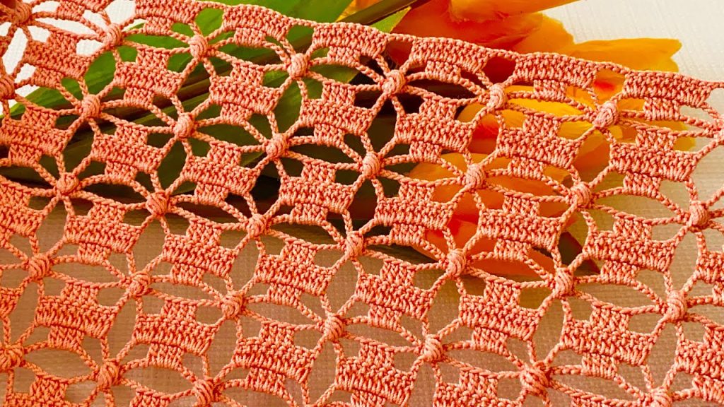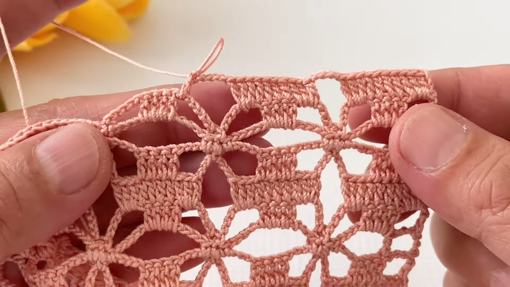 Unveil the elegance of the Desert Rose Lattice, a breathtaking border featuring interlocking geometric motifs. This pattern creates a sturdy yet airy fabric composed of small, dense squares framed by a delicate web of chains that form an eight-pointed star at every junction. The structured coral pink yarn highlights the rhythmic, repetitive nature of the design. This trim is perfect for shawls, curtains, or as a striking insert for garments.