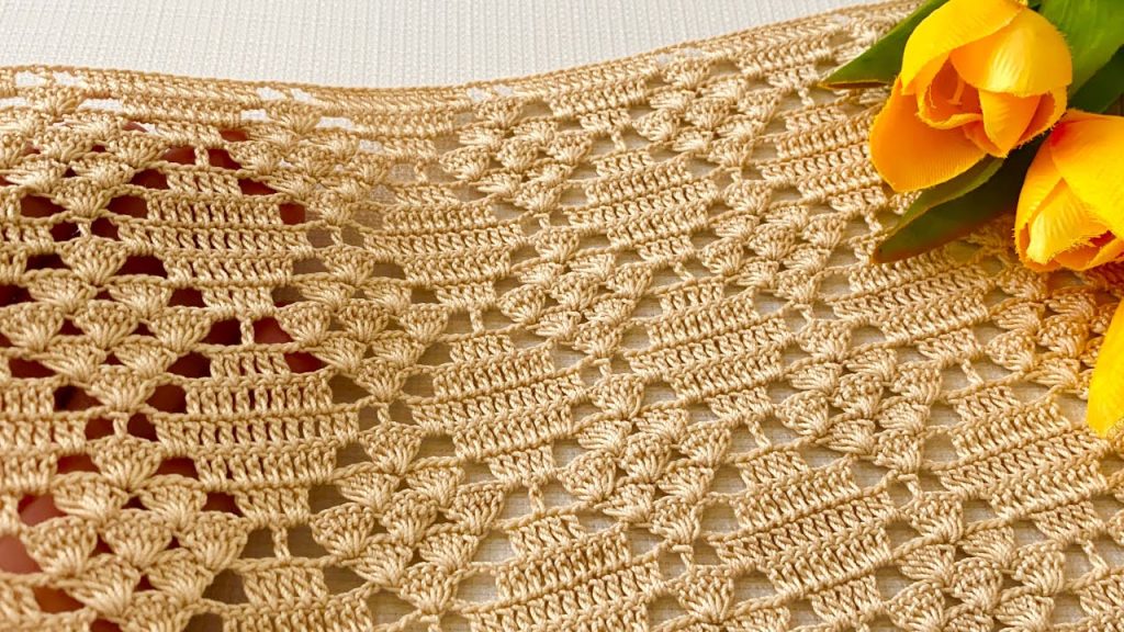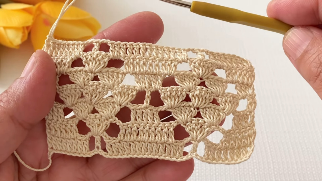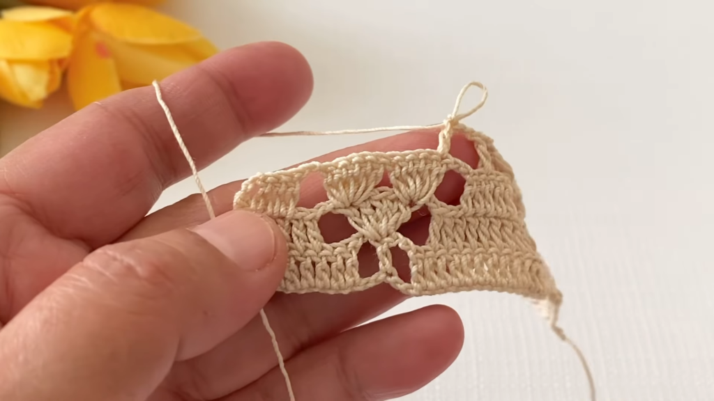 Row 1 (Foundation Net – RS): Chain the required amount (e.g., ch 123). dc in the 4th ch from the hook (counts as dc).