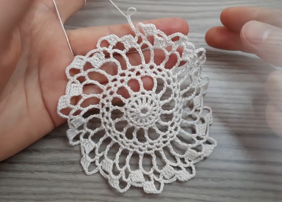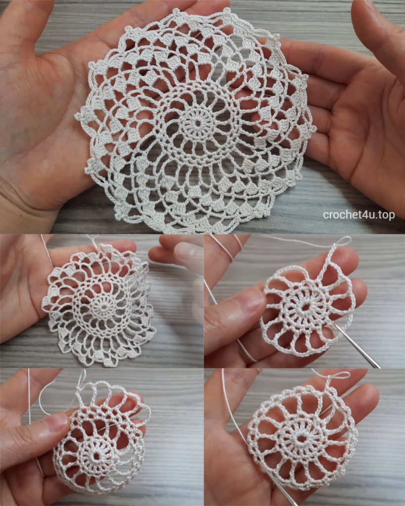 The doily is worked in continuous rounds, joining each round with a slip stitch to the top of the starting chain.