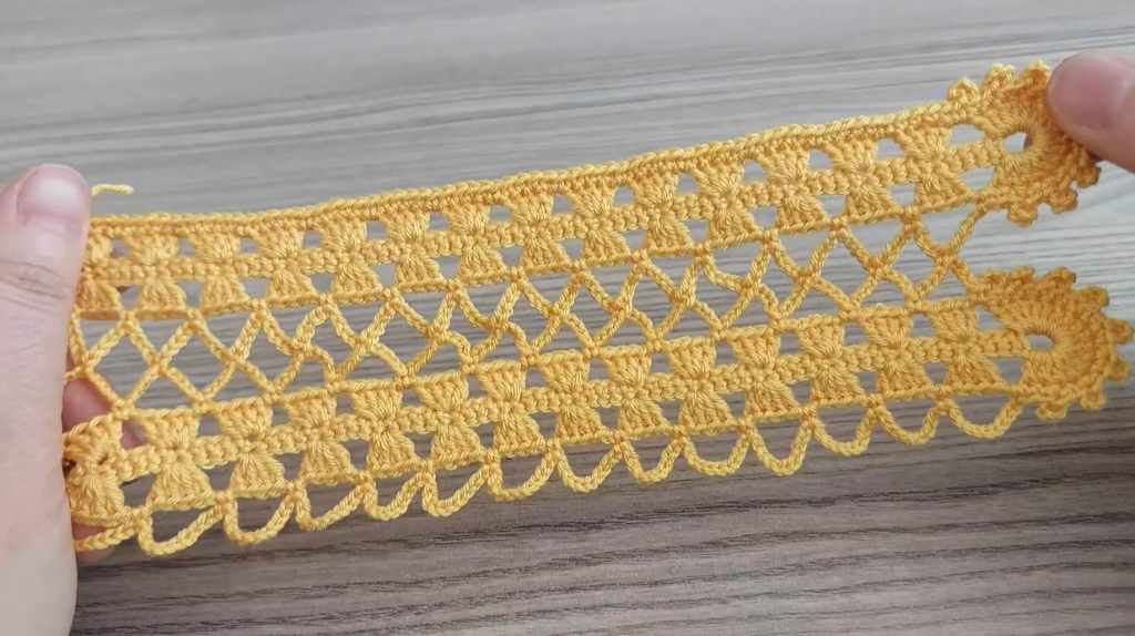 Welcome, fellow yarn lovers! Get ready to fall in love with a pattern that perfectly balances open, airy mesh with decorative, solid texture. The beautiful fabric you see above—a striking combination of geometric openwork and fan motifs, framed by a charming scalloped border—is what I call the “Golden Sunflower Lace.”