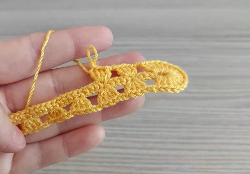 To continue the Golden Sunflower Lace pattern, you will now repeat Rows 2-5 until your project reaches your desired size, then finish with a final edging row.