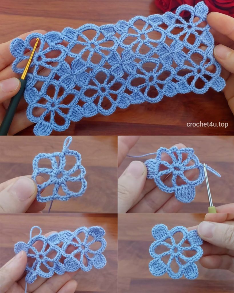 This pattern is worked in rows, where each row of flowers is created and immediately joined to the flowers of the previous row.