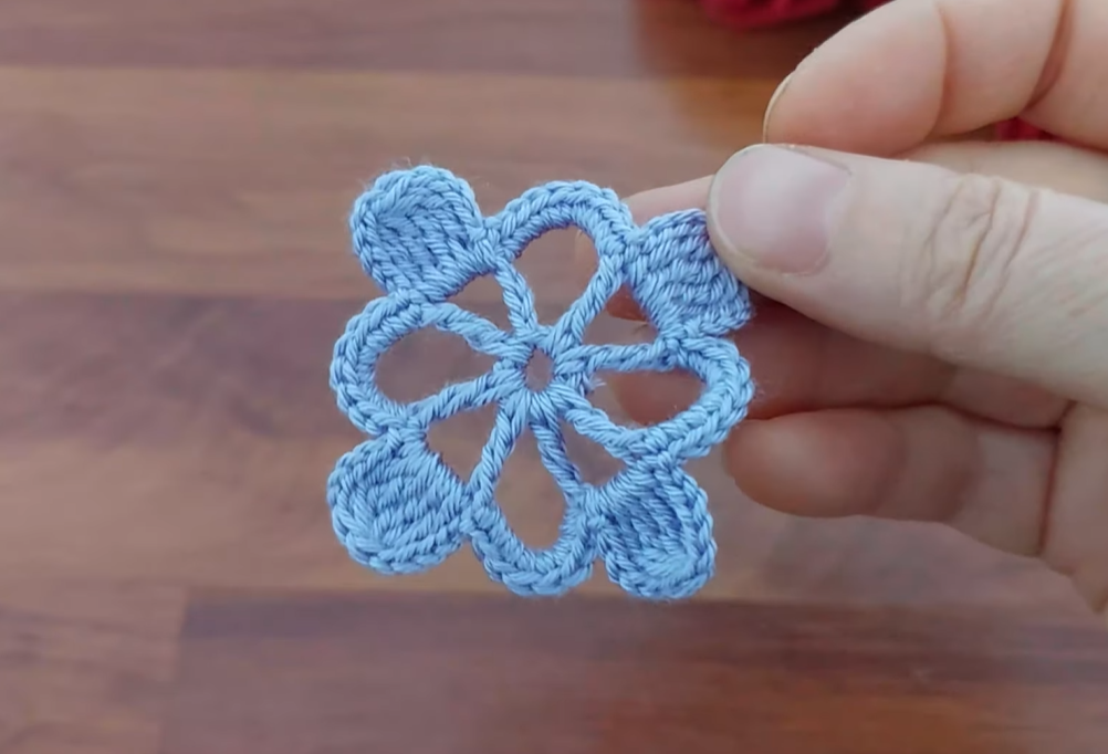 - Picot (ch 3, sl st into the first ch). Ch 1, sl st into the 3rd ch of the previous ch-6 loop (joining to the previous petal).*