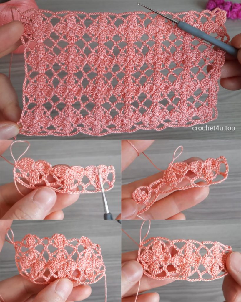 Welcome, crochet enthusiasts! If you’re looking for a project that balances openwork with a lovely, repeating texture, you’ve found it. The stitch in the image—a delicate pattern featuring open diamond netting bordered by built-in scallops—is what I call the “Coral Sea Diamond Lace.” Worked in that dreamy coral pink, it’s perfect for shawls, scarves, blankets, and table runners.