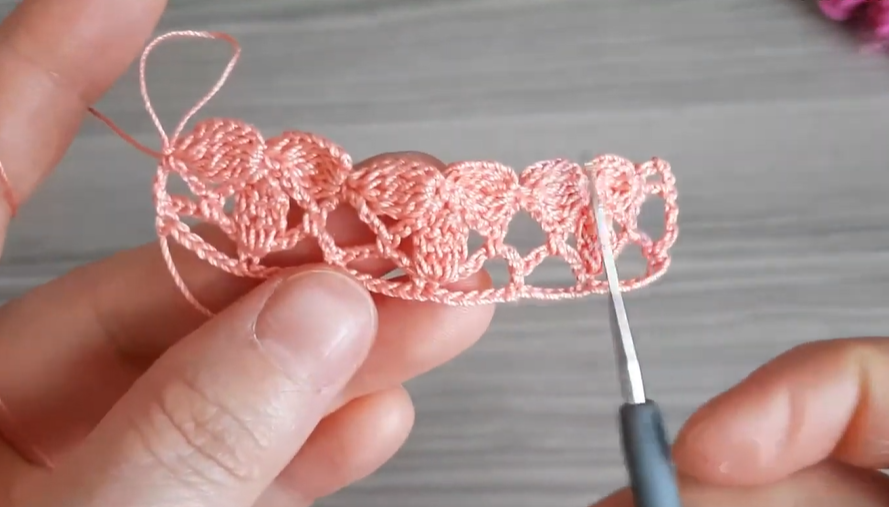 This solid row locks the mesh into the diamond shape and prepares the foundation for the deep scallop.