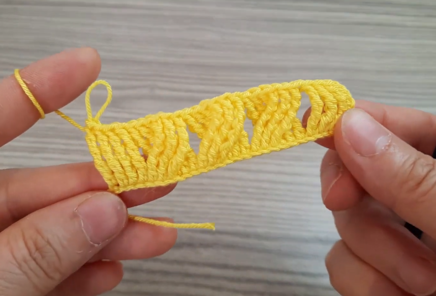 This row creates the large mesh spaces and the high posts that the traveling stitches will wrap around.