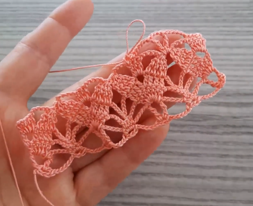 - *Ch 5, sk 7 sts (3 dc, ch 1, 3 dc of the Fan + sc), sc in the next dc (the one after the Fan).