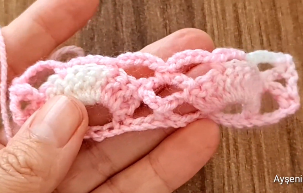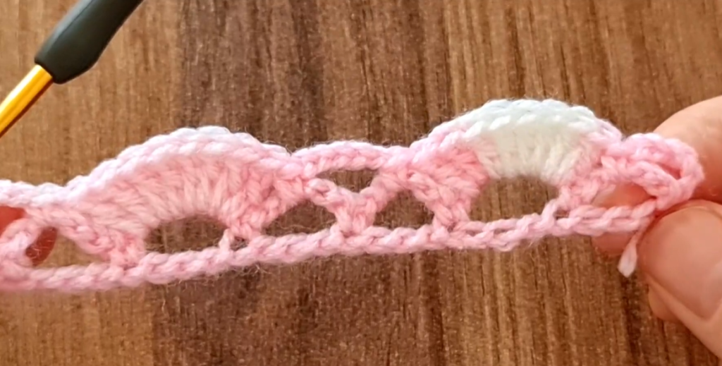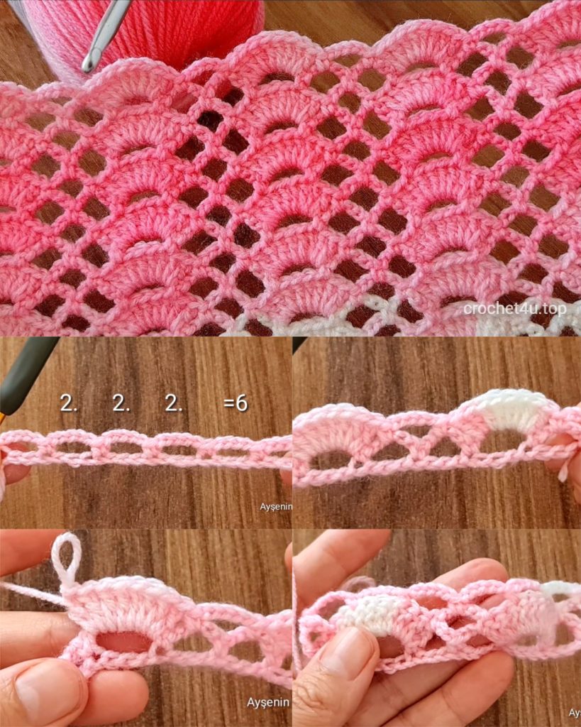 This striking texture is built through a rhythmic 4-row repeat where one color creates the dense scallops and the second color creates the open mesh separation. Let Color A = Pink, Color B = White.