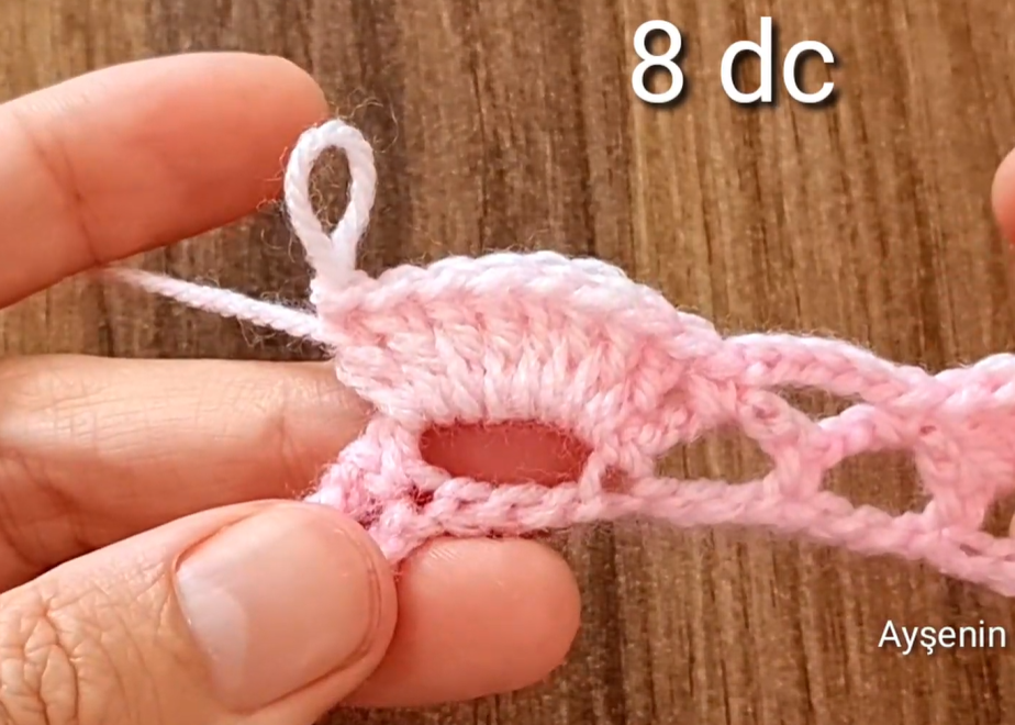 - *Ch 1, sk 1 dc, V-st (dc, ch 1, dc) in the next dc.