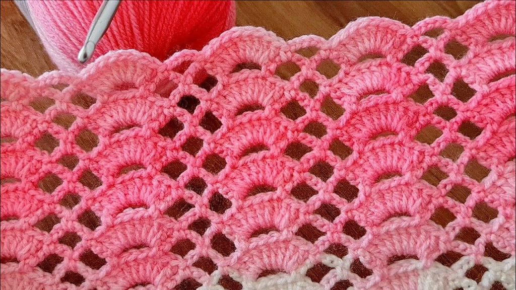 Welcome, crochet architects! Get ready to build a masterpiece with the “Tidal Wave Scallop Lace.” This stunning pattern, showcased in alternating shades of pink and white, features large, dense Shell motifs that stack and cascade, creating a beautiful “tidal wave” effect. These scallops are framed by a simple yet elegant open diamond mesh.