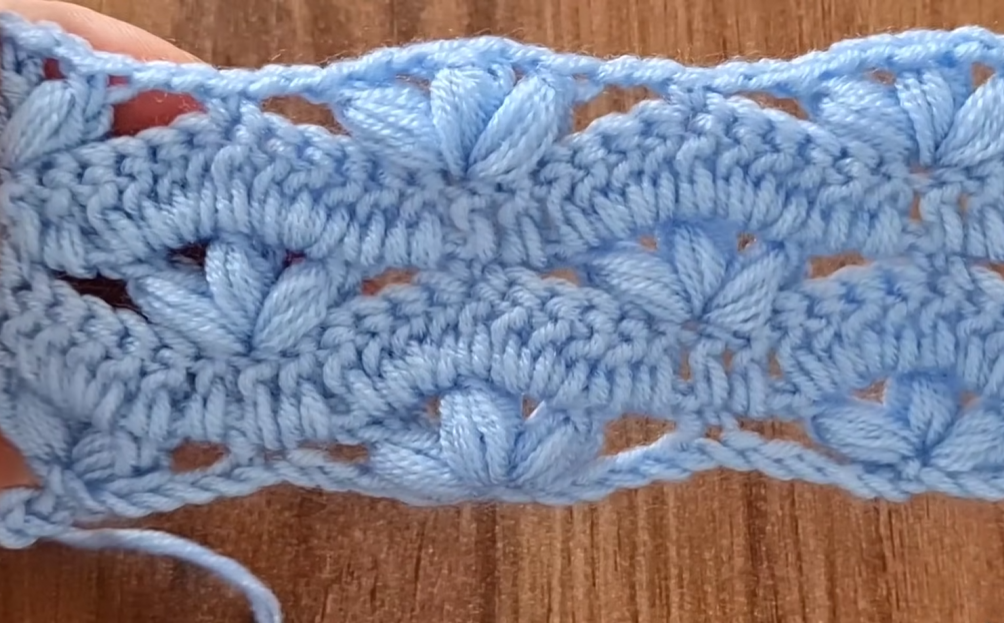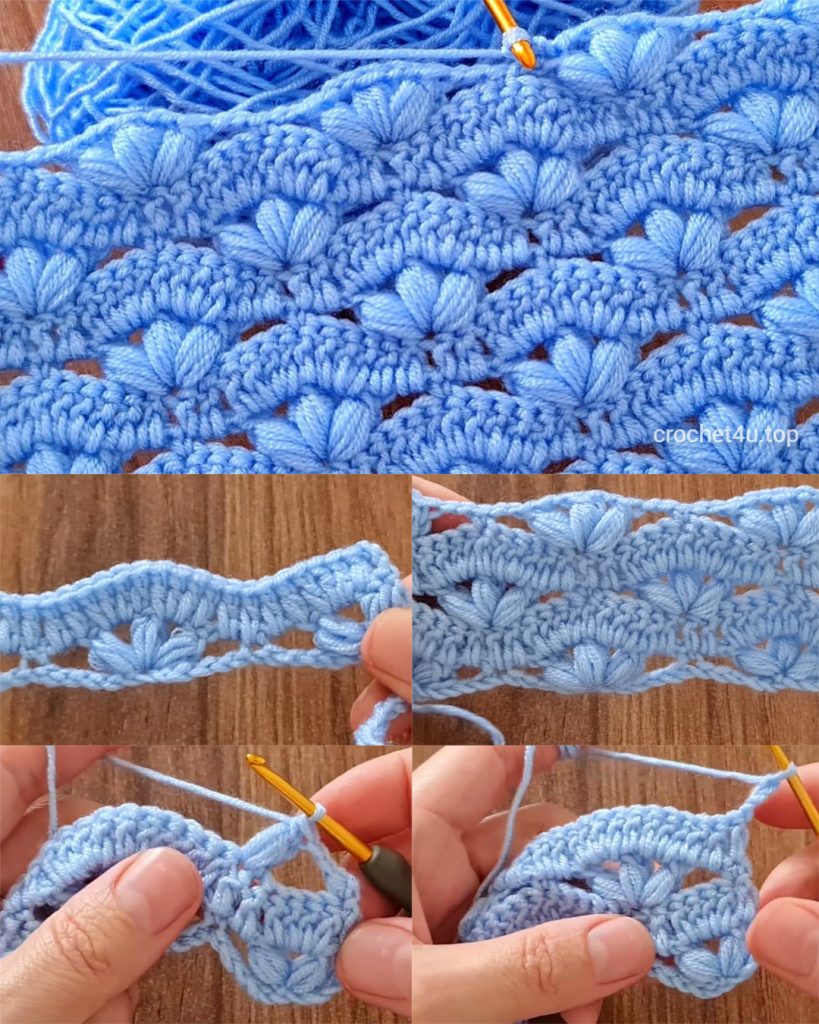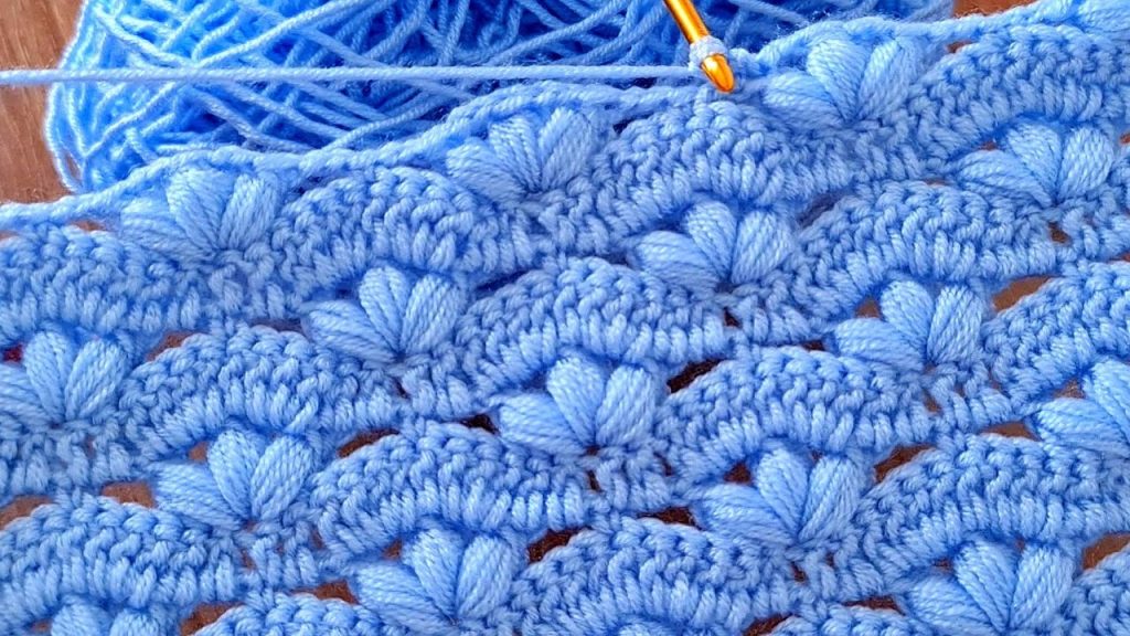 Welcome, texture enthusiasts! Today’s pattern is one of pure coziness and dimension: the “Ocean Breeze Fan Stitch.” This beautiful stitch, shown here in a lovely powder blue, combines tight rows with staggered Puff Shells (a variant of the traditional puff stitch) to create a thick, warm, and almost scalloped fabric.