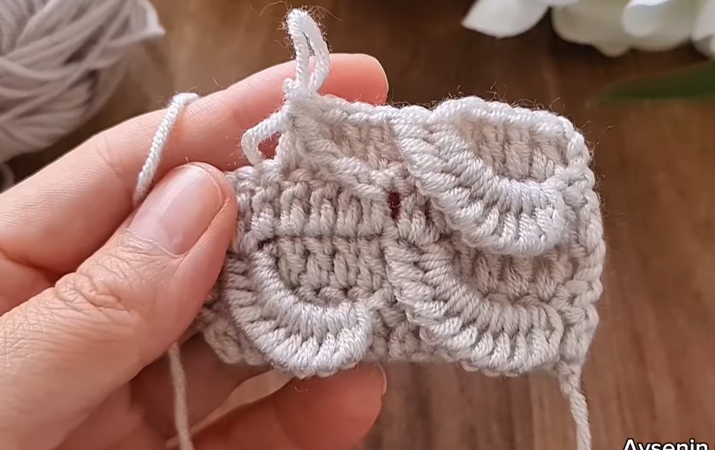 This row creates the second row of Puff-Fans, intentionally placing them in the valleys of the previous row, completing the staggered, dimensional texture.