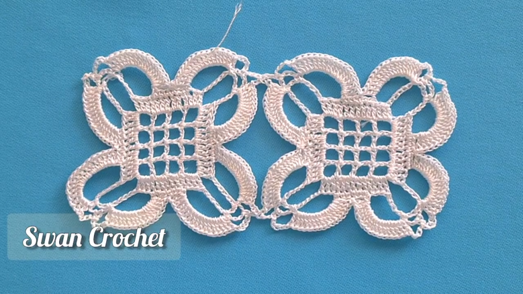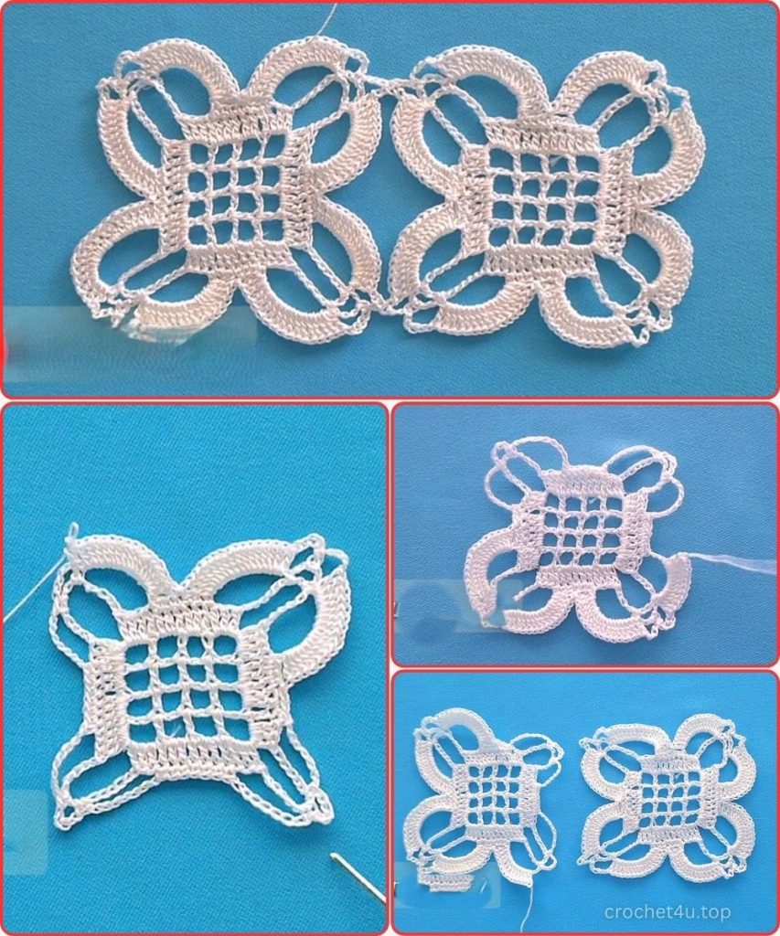 - Round 4 (Joining Round): When working Round 4 of the second motif, replace the Ch 1 and Ch 3 spaces with slip stitches into the corresponding spaces of the first, completed motif.